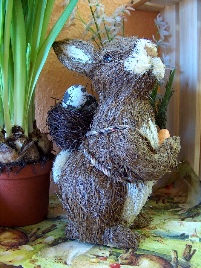 | Hase Felix aus Stroh, 24 cm hoch, stehend, mit Karotte und Korb |