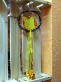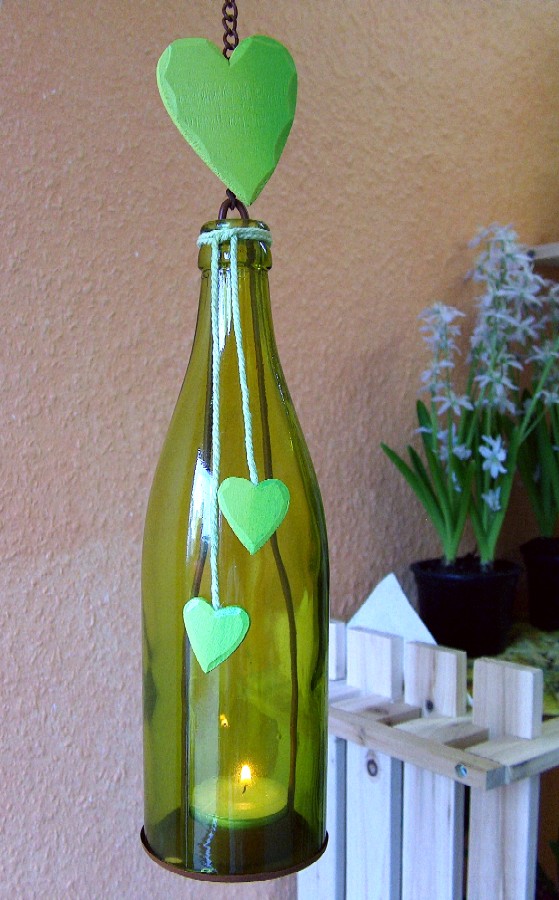 | Flasche "Herzen" grün-gelb mit Teelicht, Flasche 25 cm hoch, zum Hängen mit Kette ca. 25 cm lang |