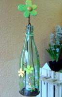 | Flasche "Blumen" grün-gelb mit Teelicht, Flasche 25 cm hoch, zum Hängen mit Kette ca. 25 cm lang |